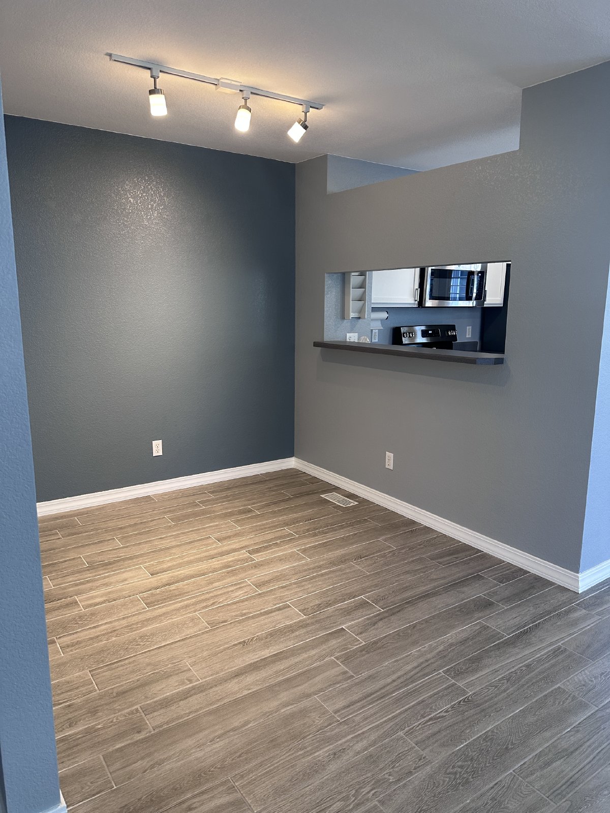 -A roomy, open kitchen with stainless steel appliances and a separate dining area.